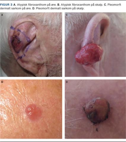 Atypisk fibroxanthom (AFX) er en sjælden tumor, som primært findes hos ældre patienter. Tumorens udvikling er stærk associeret med eksponering for ultraviolet lys, og læsionerne findes primært i solskadet hud, overvejende i hoved-hals-området [16]. Incidensen er højest i 70-årsalderen, og mænd rammes oftere end kvinder [17]. Tumorerne opstår på kort tid og er hurtigtvoksende [18]. Klinisk ses en solitær uøm, nodulær tumor, som typisk er under 2 cm stor. Farven er rødlig, og ulceration og blødning ses ofte (Figur 3). Præsentationen er uspecifik og oftest er der mistanke om mere velkendte diagnoser som planocellulært karcinom. Diagnosen stilles optimalt ved excisionsbiopsi for at skelne læsionen fra den beslægtede og mere aggressive tumor pleomorft dermalt sarkom (PDS) [19].