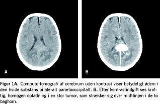 Primære lymfomer i centralnervesystemet (PCNSL) er non-Hodgkin-lymfomer (NHL), som opstår i og er lokaliseret til hjernen, spinalkanalen, subaraknoidalrummet og øjeæblet. Der er tale om sjældne tumorer, som udgør 1-2% af de intrakraniale neoplasmer og 1,5% af alle NHL [1]. I en vestdansk populationsbaseret undersøgelse fra perioden 1983-1994 fandtes en medianalder ved sygdomsdebut på 62 år (spændvidde 15-85 år) ved ikke aids-relaterede PCNSL uden kønsvariation [1]. Der er tale om ekstranodale stadie 1E-lymfomer, som ved sygdomsdebut kan være solitære, multifokale eller diffust leptomeningealt infiltrerende, og som oftest er lokaliseret supratentorielt. Undertiden rejses mistanken om et PCNSL allerede præoperativt ved computertomografi (CT) af cerebrum, hvor man til forskel fra gliomer karakteristisk kan iagttage en homogen kontrastopladende proces (Figur 1 A og B ). Diagnostikken kompliceres ofte, hvis der før operationen kortvarigt er givet behandling med kortikosteroider, idet denne behandling forbigående kan få lymfomvævet til at forsvinde, hvorfor benævnelsen ghost tumour. Den histologiske diagnose stilles i reglen ved stereotaktisk hjernebiopsi, evt. suppleret med cytologisk og flowcytometrisk undersøgelse af cerebrospinalvæske (CSF). Behandlingen vanskeliggøres af blod-hjerne-barrieren, som hæmmer en lang række hydrofile cytostatika i at trænge over i CNS i effektive koncentrationer. Ydermere er den mest effektive behandling, som består af højdosis kemoterapi kombineret med kranial bestråling, behæftet med betydelig CNS-toksicitet, hvor risikoen er størst hos ældre patienter ( > 60 år) og øges med længere overlevelse [2]. I det følgende gives der på baggrund af en litteraturgennemgang en oversigt over nyere behandlingsmuligheder af PCNSL, hvor også antistofbehandling og radioimmunterapi vil blive omtalt.