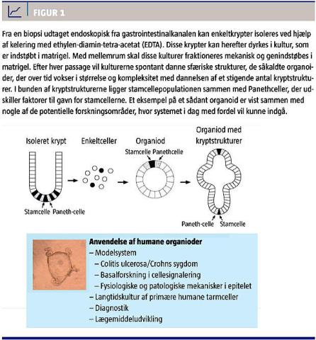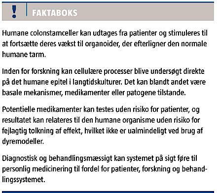 Det har tidligere ikke været muligt at have langtidskulturer af humane væv, men for blot få år siden kom der et gennembrud i dyrkningen af stamceller inden for gastroenterologien, idet en hollandsk forskningsgruppe præsenterede dyrkningen af stamceller fra mus og tillige beskrev, hvordan man kunne differentiere disse stamceller til moden tarm [4]. Siden 2009 er denne teknik blevet videreudviklet, og i 2011 lanceredes et modelsystem til dyrkning af humane intestinale stamceller [5]. Dyrkningen af humane tarmceller er langt mere kompleks end dyrkning af celler fra mus, og det er med brugen af denne protokol lykkedes at dyrke både normal tynd- og tyktarmsepitel samt kolorektal cancerepitel og metaplastisk øsofagusepitel.