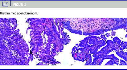 En 43-årig mand blev henvist med mistanke om recidiv af en uretralstriktur, der var blevet behandlet med intern uretrotomi ti år tidligere. Endoskopisk blev der påvist tre ikkebetydende strikturer i den penile ure-thra og tumorvæv fra 5 cm under sphincter til colliculus. Biopsi viste adenokarcinom (Figur 1 ), der var positiv for cytokeratin (CK) 7, CK20, karcinoembryonalt antigen og caudal-related homeobox-gene 2 og negativ for prostataspecifikt antigen (PSA), hvilket tydede på primær uretraltumor. Koloskopi og computertomografi (CT) af thorax og abdomen viste normale forhold.