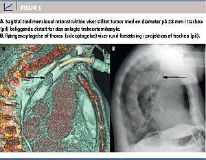 En 78-årig ikkerygende og tidligere lungerask mand blev henvist til en thoraxkirurgisk afdeling fra en lungemedicinsk afdeling med henblik på fjernelse af en tumor i trachea. Han havde været langvarigt indlagt med svær bilateral pneumoni med behov for intensivterapi og respiratorbehandling. Under indlæggelsen blev der foretaget computertomografi (CT) af thorax, der viste en endoluminal stilket tumor, der sad i trachea og næsten okkluderede hele lumen, men uden indvækst i omgivende strukturer i mediastinum (Figur 1A).