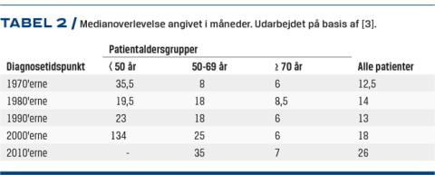 Prognosen for PCNSL har ændret sig i de seneste årtier. Median-OS er øget fra 12,5 mdr. i 1970’erne til nu 26 mdr. (Tabel 2). For patienter under 50 år er der sket en stigning i median-OS fra 35,5 til 134 mdr. For patienter > 70 år er der ikke observeret stigning i median-OS, der i dag er på 7 mdr. Dette er i særdeleshed problematisk, da der i aldersgruppen 70-79 år i dag er en ti gange forøget incidens af PCNSL end i den resterende befolkning [3].].