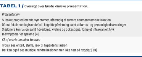 Symptomerne på PCNSL afhænger af tumorens neuroanatomiske lokalisation. Patienterne kan have fokale neurologiske deficit, kognitiv påvirkning, konfusion og symptomer på forhøjet intrakranielt tryk (hovedpine, kvalme og opkastninger) (Tabel 1). Ved leptomeningeal involvering kan der forekomme kranienerveudfald, radikulære sensoriske symptomer og motoriske udfald. Systemiske B-symptomer ses sjældent [4].