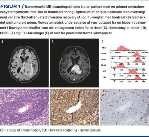 Den foretrukne skanningsmodalitet er MR-skanning (T1-vægtet med gadoliniumkontrast). Den viser typisk homogent kontrastopladende, ventrikelnære læsioner uden central nekrose [5]. Derudover er der et karakteristisk udseende på MR-fluid-attenuated inversion recovery-sekvenser (Figur 1) [6]. Positronemissionstomografi (PET)/CT af hjernen kan muligvis vejlede ved skelnen mellem PCNSL og andre maligne hjernetumorer, men er endnu ikke implementeret i rutinediagnostik [7].