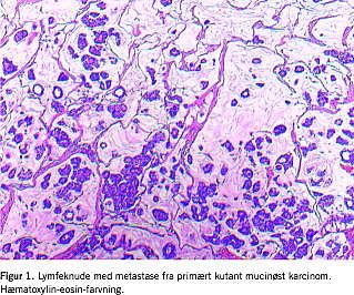 Primært kutant mucinøst karcinom er en sjælden malign tumor, som udgår fra svedkirtlerne. Lidelsen fejldiagnosticeres ofte, fordi den klinisk præsenterer sig meget varierende. Mikroskopisk kan tumoren være vanskelig at skelne fra en kutan metastase fra et mucinøst karcinom i colon, bryst eller ovarier. Tumoren recidiverer ofte, men mortaliteten er lav. Denne patient udviklede regionale lymfeknudemetastaser fem år efter ekscision af den primære tumor.