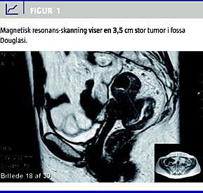 Denne sygehistorie omhandler en 58-årig kvinde, der tidligere var hysterektomeret og ooforektomeret for en benign lidelse, og som igennem to måneder havde haft vekslende afføringsmønstre og intermitterende friskt blod med afføringen. Der var intet vægttab eller vaginal blødning, men dysuri og hyppige vandladninger. Ved rektal- og vaginal eksploration fandtes en fast, mobil knytnævestor tumor i fossa Douglasi. Der fandtes ingen abnormiteter ved vaginal inspektion, og ved sigmoideoskopi var der en stenose 10 cm fra anus, som ikke kunne passeres. Der sås ingen synlige slimhindeforandringer. Vaginal ultralydskanning og magnetisk resonans-skanning viste en tumor i fossa Douglasi med indvækst i vagina og rectum uden tegn på lokal spredning eller fjernmetastaser (Figur 1 ).