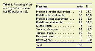 Synovialt sarkom er en bløddelsneoplasme med høj malignitetsgrad. Synovialt sarkom udgør 8% af samtlige bløddelssarkomer, og 95% af disse findes i relation til ekstremiteterne (Tabel 1). Synovialt sarkom kan dog også opstå i relation til andre væv uden synovialis, som f.eks. tunge, øsofagus, larynx, lunge, hjerte [2], og retroperitonalt [3]. Synovialt sarkom på ekstremiteterne findes oftere hos mænd end hos kvinder (2:1), og patienternes gennemsnitsalder er 30-40 år [3].
