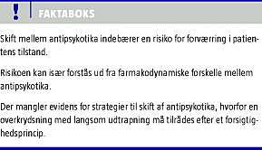 Der mangler imidlertid studier, hvor man systematisk og validt med et stort patientmateriale undersøger skift mellem de hyppigst anvendte AP. Fraset [17] er der i alle studierne tale om skift fra flere forskellige AP til andet AP. Der mangler studier af skift fra og til amisulprid og quetiapin, der i Region Hovedstaden er det anbefalede førstevalg til behandling af debuterende skizofreni. I de studier, der er inddraget i denne artikel, har man kun fundet en lille, hvis overhovedet nogen, forskel mellem forskellige skiftstrategier, men resultaterne fra enkelte studier tyder på, at der ved valg af en forkert strategi for skift af AP er en ikke uvæsentlig risiko for forværring i patientens tilstand.
