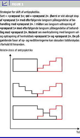 Der er stor variation i effekt og bivirkninger af antipsykotika (AP), og det vil ofte være nødvendigt successivt at forsøge behandling med flere præparater, før den optimale behandling til den enkelte patient er fundet. Fundene ved Clinical Antipsychotic Trials of Intervention Effectiveness (CATIE) indikerer, at de fleste patienter med skizofreni vil skifte AP op til flere gange [1]. Der findes flere strategier for skift af AP: abrupt stop af behandling med »præparat 1« med samtidig påbegyndelse af behandling med »præparat 2«, langsom udtrapning af »præparat 1« med efterfølgende, men tidsmæssigt forskudt påbegyndelse af behandling med »præparat 2« og overkrydsning mellem de to præparater (Figur 1 ). I det følgende vil farmakodynamiske og farmakokinetiske problemer ved præparatskift blive diskuteret, og afslutningsvis vil studier af strategier til skift af AP blive præsenteret.