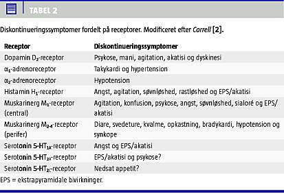 Ved skift af AP er det afgørende, om der skiftes mellem præparater med stor forskel i receptorbindingsprofil (for oversigt se [2] og Tabel 1 ). Ved behandling med AP sker der en opregulering af blokerede receptorer fraset serotonin 5-HT2A -receptoren, der nedreguleres [3], men som muligvis efter clozapinseponering opreguleres til et højere niveau end før clozapinindgift [4]. Ved hurtig seponering af et AP kan der være risiko for en overaktivitet i de receptorsystemer, som »præparat 2" blokerer i lavere grad end »præparat 1«. De symptomer, der evt. opstår, kan i høj grad forudses ud fra de respektive AP's bindingsprofiler [2]. Symptomerne kan skyldes dopaminerg, muskarinerg, histaminerg eller serotonerg overaktivitet (Tabel 2 ). Forskelle i AP's farmakodynamik medfører desuden forskelle mht., hvor hurtigt et givent AP kan optrappes. Skift til et præparat med relativt højere grad af α1-adrenerg blokade i forhold til dopamin (DA) D2 -receptor-blokade vil kræve en længere optrapningsperiode pga. risiko for ortostatisk hypotension.