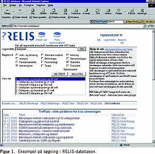 I form og indhold minder RELIS-databasen om Drugline, men kan i modsætning til denne benyttes gratis. De svenske (og danske) LIC lægger kun udvalgte redegørelser ind i databasen Drugline [5]. I RELIS-databasen udelades kun de redegørelser, som udelukkende henviser til tidligere RELIS-svar. Selv om enkelte spørgsmål er patientspecifikke, mener vi, at disse alligevel kan have genbrugsværdi ved senere henvendelser af lignende karakter. Alle spørgsmål og svar er skrevet på norsk. Der fandtes i maj 2003 ca. 4.500 redegørelser i RELIS-databasen, et antal vi mener giver eksterne brugere gode muligheder for at finde relevante redegørelser.
