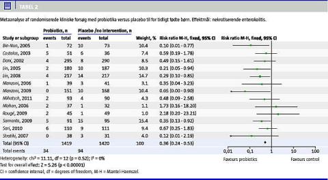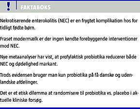 I Danmark bliver ca. 7% af alle børn født for tidligt, det vil sige fødsel før fulde 37 svangerskabsuger [4]. Behandlingen af for tidligt fødte børn er forbedret markant, siden man påbegyndte brugen af antenatal steroider ved truende for tidlig fødsel, behandling med surfaktant og med introduktionen af neonatale intensivafsnit i begyndelsen af 1980'erne [5, 6]. I dag udvikler langt de fleste for tidligt fødte børn sig normalt, men ikke overraskende er der fortsat en betydelig dødelighed (20%) blandt de meget og ekstremt for tidligt fødte børn, dvs. børn født før 32 svangerskabsuger [7]. En frygtet komplikation er nekrotiserende enterokolitis (NEC), som er en livstruende tilstand, der kan medføre malabsorption, korttarmssyndrom, strengileus og stenose. Årsagen til NEC er multifaktoriel [8, 9]. Der foregår intensiv forskning for at prædiktere og forebygge NEC. Man ved, at præmaturitet disponerer til NEC, og at mælk fra moderen nedsætter risikoen for NEC. Mikrofloraen har også en vigtig betydning i udviklingen af NEC. Derfor kunne probiotika i teorien have en sundhedsfremmende effekt ved i tarmen at skabe en mikrobiel sammensætning, som modulerer den immunologiske kaskade og derved nedsætter udviklingen af NEC. For nylig påviste man i to uafhængige metaanalyser af randomiserede kliniske forsøg, at probiotika mere end halverede både risikoen for udvikling af NEC og dødeligheden [1, 2]. Denne overvældende effekt kræver et nærmere »eftersyn«, og i det følgende vil metaanalyserne bliver kritisk vurderet.
