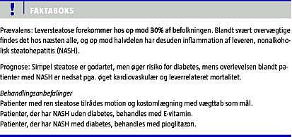 Summary Prognosis and treatment of non-alcoholic fatty liver disease and steatohepatitis Ugeskr Læger 2012;174(8):488-490 Non-alcoholic fatty liver disease (NAFLD) and steatohepatitis (NASH) are among the most common liver diseases. NAFLD with pure steatosis is considered benign. NASH, however, may progress to liver cirrhosis with risk of liver cancer. Therefore, it is important to search for treatment modalities for NASH. Because obesity and insulin resistance are risk factors for NASH, weight loss and exercise are considered mandatory, although limited data are in support. Presently, we focus on the prognosis of NAFLD and NASH and on pharmaceutical treatment, especially in the form of vitamin E and pioglitazone.