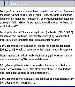 Andelen af flerfoldsgraviditeter efter ART i Danmark er næsten halveret gennem de seneste ti år og har i de seneste år været på omkring 16%. Samtidig er forekomsten af trillinger efter ART stort set elimineret [1]. Dette skyldes, at man hos yngre kvinder, der har god ægkvalitet, i tiltagende grad vælger elektiv single embryo transfer , hvor man kun lægger et enkelt befrugtet æg tilbage i livmoderen. I lande som Sverige og Finland, hvor man ved 60-70% af alle ART-behandlinger kun lægger et befrugtet æg tilbage ad gangen, er tvillingefødselsraten på 5-10%. Tvillinger har generelt en betydelig højere risiko for at få perinatale komplikationer, end enkeltfødte børn har, og tvillinger, som er født efter ART, fødes i gennemsnit tre uger tidligere og med en fødselsvægt, som er 1.000 g mindre end enkeltfødte, som er født efter ART. Kun 1-2% af alle tvillinger, som er født efter ART, er monozygote, hvorimod 20-30% af de spontant konciperede tvillingegraviditeter er monozygote. De monozygote tvillinger har med risikoen for tvillingetransfusionssyndrom samlet set en dårligere prognose end dizygote tvillinger. Hvis man sammenligninger tvillinger, der er født efter ART, med tvillinger, der er spontant konciperet, finder man dog alligevel en lidt øget risiko for perinatale komplikationer hos de tvillinger, som er født efter ART [16]. Sammenligner man udelukkende dizygote tvillinger, der er født efter ART, med dizygote tvillinger, der ikke er født er ART, understøttes dette yderligere [17]. Risikoen for neurologiske senfølger såsom cerebral parese er højere hos tvillinger end hos enkeltfødte, men er fundet at være ens hos tvillinger, uanset om de er født efter ART eller ej, OR: 0,99 [95% KI: 0,74-1,33] [18]. Tvillinger, som er født efter ART, har ligesom de enkeltfødte en let øget risiko for medfødte misdannelser.