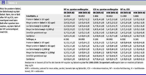 I flere metaanalyser har man dokumenteret, at enkeltfødte børn, som er undfanget ved ART, har ca. dobbelt så stor risiko for at blive født prætermt (gestationsalder < 37 uger), oddsratio (OR): 1,84-2,04, og godt halvanden gang øget risiko for at blive født med lav fødselsvægt (< 2.500 g), OR: 1,6-1,7 (Tabel 1 ) [3, 4]. Derudover har disse børn også en øget risiko for intrauterin væksthæmning og perinatal mortalitet sammenlignet med spontant undfangede børn [3, 5, 6]. Forældrenes nedsatte frugtbarhed, mødrenes højere gennemsnitsalder og nulliparitet er en del af forklaringen på det dårligere fødselsudfald blandt børn, som er født efter ART. Men også det faktum, at hvis man ved ART-behandling som hovedregel lægger to befrugtede æg tilbage i livmoderen, medfører dette, at ca. 10% af alle ART-enkeltfødte er resultatet af en »vanishing twin -graviditet«. De enkeltfødte, som overlever en »vanishing twin «, har højere risiko for dårligere fødselsudfald, end enkeltfødte fra graviditeter med kun en gestation fra begyndelsen har, og den negative påvirkning af den overlevende tvilling er større, jo senere i graviditeten den anden tvilling går til grunde [7].