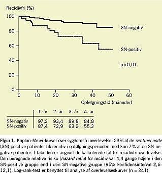 Fælles for såvel de udenlandske serier, de to publicerede danske undersøgelser og den nuværende opgørelse er, at gruppen af SN-positive MM-patienter har en væsentlig dårligere prognose end de SN-negative patienter. I vores opgørelse er den relative risiko for recidiv mere end fire gange højere ved SN-positivitet end ved SN-negativitet, og den recidivfri fireårsoverlevelse var kun 55% i den SN-positive gruppe mod 85% i den SN-negative gruppe (Figur 1). Den dårlige prognose efter recidiv af MM afspejler sig i vores opgørelse med fund af en fireårs MM-specifik mortalitet på 36% i den SN-positive gruppe mod kun 3% i den SN-negative gruppe. Dette på trods af, at der er tale om subkliniske lymfeknudemetastaser, og at der udføres opfølgende radikal lymfeknuderømning i tæt relation til SNB.
