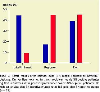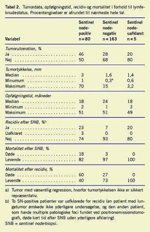 Resultater: Ved sentinel node- biopsi påvistes tidlig regionær lymfeknudemetastasering hos 32%. Ved radikal lymfeknuderømning fandtes yderligere lymfeknuder med metastaser hos 24%. Den mediane opfølgningstid var 21 måneder (spændvidde 1-51 måneder). 7% af de sentinel node- negative patienter fik recidiv under opfølgningsperioden mod 23% af de sentinel node- positive patienter. Mediantiden til recidiv var 14 måneder. Recidivfri toårs- og fireårsoverlevelse var hhv. 93% og 85% for de sentinel node-negative patienter mod hhv. 73% og 55% for de sentinel node- positive patienter. Risikofaktorer for recidiv var: gennemvækst af sentinel node-lymfeknudekapslen, mere end en sentinel node med metastase og yderligere metastatiske lymfeknuder fundet ved den radikale lymfeknuderømning. 18% af de sentinel node- positive patienter døde i opfølgningstiden mod 3% af de sentinel node- negative. Den malignt melanom-specifikke toårs- og fireårsoverlevelse var hhv. 84% og 64% i den sentinel node- positive gruppe mod 99% og 97% i den sentinel node- negative gruppe.
