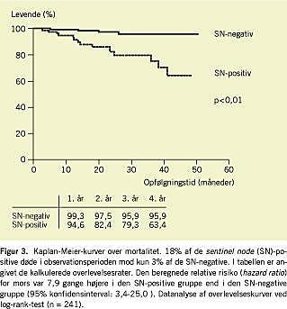 Mortaliteten var væsentlig højere hos de SN-positive patienter, idet 18% af de SN-positive patienter døde i opfølgningsperioden mod 3% af de SN-negative patienter (p < 0,01) (Figur 3). Den gennemsnitlige tid (mediantid) fra SNB til mors var 14 måneder (spændvidde 3-42 måneder). Af de fire dødsfald i den SN-negativ-gruppen var de tre på grund af metastaserende MM, mens et dødsfald var uden relation til MM. Hos de SN-positive var 12 af de 14 dødsfald forårsaget af MM, et dødsfald var ikke MM-relateret, og i et tilfælde kunne dødsårsagen ikke fastlægges med sikkerhed. Den MM-specifikke toårs og fireårsoverlevelse var henholdsvis 99% og 97% i den SN-negative gruppe mod henholdsvis 84% og 64% i den SN-positive gruppe.