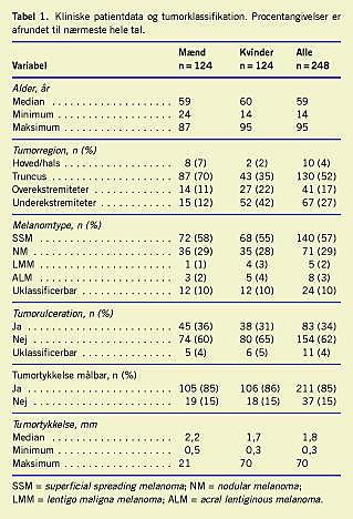 I fireårsperioden fra januar 2001 til december 2004 gennemgik 248 konsekutive MM-patienter: 124 mænd og 124 kvinder med en gennemsnitsalder på 59 år og en gennemsnitlig tumortykkelse på 1,8 mm, SNB på Plastikkirurgisk Afdeling, Roskilde Amts Sygehus Roskilde. Væsentlige patient- og tumorkarakteristika er angivet i Tabel 1 . Mænd og kvinder adskilte sig ikke væsentligt med hensyn til de angivne karakteristika bortset fra tumorplacering og tumortykkelse: kvinder havde som forventet flere MM på underekstremiteterne og mænd havde flere MM på truncus mens tumortykkelsen var mindre hos kvinder end hos mænd (p = 0,04) (Tabel 1).
