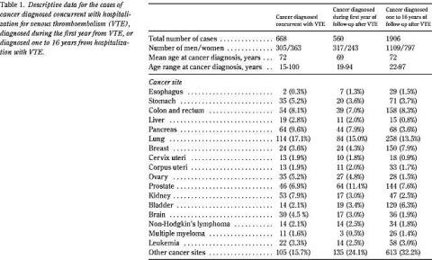 <li>Baron JA, Gridley G, Weiderpass E, Nyren O, Linet M. Venous thromboembolism and cancer. Lancet 1998;351:1077-80. (Erratum, Lancet 2000; 355:758).</li>