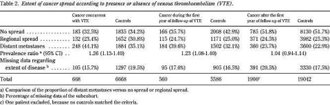 Tabel 1 viser karakteristika for de tre kohorter med venøs tromboembolisme og kontrolpersoner. De hyppigste cancertyper var lunge-, prostata-, colon- og rectum-, mam ma- og pancreascancer. Andelen af patienter med cancer og venøs tromboembolisme, hvor der var oplysninger om spredning på diagnosetidspunktet, svarede omtrent til andelen blandt kontrolpersonerne (Tabel 2 ). Blandt patienter, hvor cancer var diagnosticeret på samme tidspunkt, som de blev indlagt for venøs tromboembolisme, havde 44% fjernmetastaser mod 35,1% blandt kontrolpatienterne (prævalensratio 1,26, 95%'s sikkerhedsinterval, 1,13-1,40). Blandt patienter, hvor kræftdiagnosen blev stillet et år efter, at de blev indlagt for venøs tromboembolisme havde 39,6% fjernmetastaser mod 32,1% blandt kontrolpersonerne (prævalensratio 1,23, 95%'s sikkerhedsinterval, 1,08-1,40). For patienter, hvor kræftdiagnosen blev stillet mere end et år efter, at de blev indlagt for venøs tromboembolisme, var andelen af patienter med fjernmetastaser stort set ens (prævalensratio 1,04, 95%'s sikkerhedsinterval, 0,94-1,14).