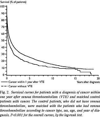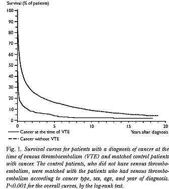 Fig. 1 viser overlevelseskurven for patienter, som fik stillet diagnosen kræft på samme tidspunkt, som de blev indlagt for venøs tromboembolisme, og for deres kontrolpersoner.