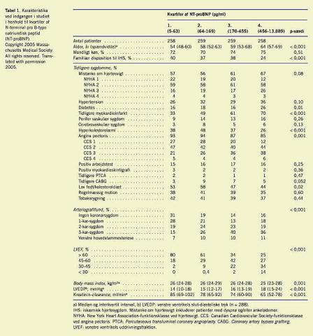 Karakteristika for patienterne ved indgangen i studiet inddelt i kvartiler af NT-proBNP kan ses i Tabel 1. NT-proBNP var generelt forhøjet med medianværdi på 169 ng/l (interkvartilinterval 63-456). Med stigende NT-proBNP-værdier var patienterne ældre, havde i højere grad haft tidligere myokardieinfarkt og havde højere prævalens af 3-kar-sygdom og hovedstammestenose vurderet ved koronararteriografi. Patienter med NT-proBNP-værdier i øverste kvartil havde mere diabetes end patienter med NT-proBNP-værdier i laveste kvartil. LVEF, body mass index (BMI) og kreatinin-clearance var lavere med stigende NT-proBNP-værdier.