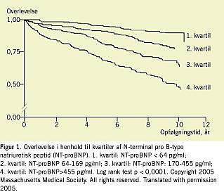 Efter en median opfølgningstid på 9,2 år var 288 (28%) patienter døde. Den mediane værdi af NT-proBNP var lavere blandt de patienter, der overlevede, end blandt dem, som var døde (120 ng/l vs. 386 ng/l, p < 0,0001). Kaplan-Meier-estimater for overlevelse i kvartiler af NT-proBNP er vist i Figur 1.