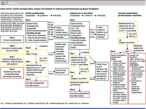 En uventet vanskelig luftvej i forbindelse med intubation er en højrisikosituation med øget mortalitet og morbiditet [1]. Der er både internationalt og nationalt udfærdiget forskellige luftvejsvurderingskemaer og action card med det formål at kunne forudsige og håndtere en uventet vanskelig luftvej. De mest benyttede action card er udviklet af American Society of Anesthesiology og Difficult Airway Society. Sidstnævnte er videreudviklet på Aalborg Universitetshospital (Figur 1) og bruges sammen med Simplified Airway Risk Index (SARI) til vurdering af en patients luftveje.