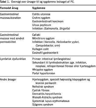I mave-tarm-kanalen kan næsten enhver sygdomsproces give anledning til PE; både inflammatoriske, ulcerøse og nonulcerøse mucosalidelser og sygdomme med abnormt lymfeflow [9]. Muligheden for PE bør derfor overvejes, når der er hypoproteinæmi i forbindelse med gastrointestinal sygdom.