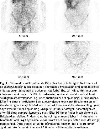 En lovende teknik er 111 In-transferrinundersøgelsen, som giver mulighed for såvel lokalisering som kvantificering af proteintabet ved PE i én procedure, der er enkel og fri for fæcesopsamling [35-37]. Lokaliseringen sker ved scintigrafi af abdomen (Fig. 1 ). Kvantificeringen foregår ved beregning af plasmahalveringstider og helkropsaktivitetsudskillelse. Forbindelsen er stabil, og scintigrafisk opladning i tarmen er ensbetydende med tab af protein til tarmlumen, idet transferrin ikke udskilles ekstraintestinalt. Desværre er metoden ikke valideret over for veletablerede proteintabsundersøgelser, og størrelsen af det fysiologiske intestinale transferrintab kendes ikke. Det kan antages, at tabet ligesom ved 51 CrCl3 -undersøgelsen normalt er < 1% over fire døgn, idet 51 CrCl3 indgivet intravenøst også bindes til transferrin. Ved tilfredsstillende evaluering af metoden kunne den formentlig med fordel bruges rutinemæssigt til diagnosticering og monitorering af PE, der derved kunne undersøges nærmere og måske oftere behandles sufficient.