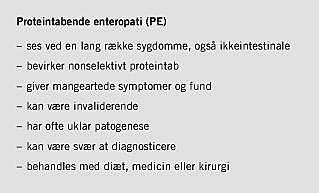 Excessivt gastrointestinalt proteintab, proteintabende gastroenteropati eller blot proteintabende enteropati (PE), ses i forbindelse med en lang række sygdomme, såvel lidelser begrænset til mave-tarm-kanalen som systemsygdomme med sekundær involvering af denne (Tabel 1 ).