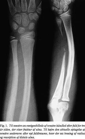 Patienten kom på ny i skadestuen efter fald, hvor hun havde taget for sig med ve. hånd. Objektivt fandtes ømhed og mistanke om fraktur af distale antebrachium, men ingen tegn på instabilitet af håndleddet. Røntgenundersøgelse af underarmen viste tiltagende bowing af radius samt resorption af den distale halvdel af ulnadiafysen, men med bevaret distal ulnametafyse. Der var forkortning af ulna og let deformering af den distale radiusepifyse. Der var ingen friske frakturer eller afrivninger (Fig. 1).