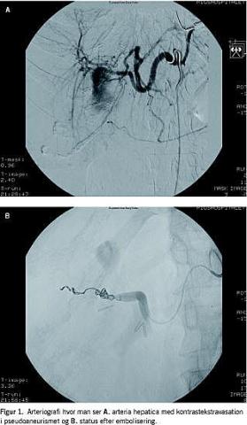 Der er i den internationale litteratur beskrevet 45-50 tilfælde, hvor pseudoaneurismet blev dannet på a. hepatica dextra i 61% af tilfældene [1]. Dette var også tilfældet hos vores patient. Hovedsymptomet hos to tredjedele af patienterne er gastrointestinal blødning som følge af hæmobili (blødning i de dybe galdegange) [1]. Hos vores patient var blødningen udelukkende intraperitoneal. Symptomerne opstår ofte med et frit interval på fra få dage til tre måneder [2], alt afhængigt af hvor hurtigt hæmatomkapslen rumperer. Vores patients symptomer debuterede efter 13 dage. I litteraturen kunne behandlingen udføres ved embolisering i 82% af tilfældene, mens åben kirurgi var nødvendig hos 18% [1]. Hæmodynamisk påvirkning kontraindicerer ikke embolisering.