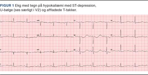 Patienten blev indlagt på en neurologisk afdeling. De primære differentialdiagnoser var Guillain-Barrés syndrom, myopati og cervikal myelopati. Der blev udført akut MR-skanning af columna totalis, som var uden abnormiteter. De biokemiske undersøgelser viste svær hypokaliæmi med sekundær rabdomyolyse. P-kaliumniveauet var 1,6 (referenceværdi: 3,5-4,4) mmol/l, p-natriumniveauet var 145 (referenceværdi: 137-144) mmol/l og p-kreatinkinaseniveauet var på 25.100 (referenceværdi: 50-150) E/l. Blodtrykket var 180/98 mmHg, og der var ekg-forandringer med tegn på svær hypokaliæmi (Figur 1). Patienten blev overflyttet til et kardiologisk afsnit mhp. telemetri, mens kaliumniveauet blev korrigeret med spironolacton, kaliummikstur, kaleorid og Na-K-infusion. Patientens hypokaliæmi rettede sig over få dage med fuld remission af pareser og kardiel påvirkning.