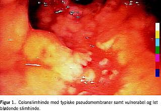En 81-årig kvinde, i det væsentlige rask, blev behandlet med ampicillin og erytromycin af egen læge for pneumoni og senere med cefuroxim under indlæggelse. Efter udskrivelse fik hun tiltagende diare, kvalme og mavesmerter. Efter tre uger havde hun daglig op til 15 vandtynde diareer uden blod eller slim med udtalte mavesmerter. Efter genindlæggelse sås der ved sigmoideoskopi pseudomembranøse forandringer og vulnerabel let blødende slimhinde (Figur 1). Pga. hypotension blev patienten overført til et andet sygehus. Ved ankomst fandtes: temperatur 37,9 °C, blodtryk 85/55 mmHg, leukocytter 33,2 × 109/l og C-reaktivt protein (CRP) 267 mg/l. Abdomen var meteoristisk med udtalt ømhed. På mistanke om PMC og sepsis blev der påbegyndt behandling med intravenøst givet ampicillin, gentamicin og metronidazol. Pga. manglende respons ændredes behandlingen til vancomycin 250 mg × 4 i kapsler suppleret med metronidazol og cipro-floxacin givet intravenøst. Resultatet af en bloddyrkning var negativt. En oversigt af abdomen viste colondilatation, fortykkelse af tarmvæggen uden fri luft eller toksisk megacolon. Fæcesdyrkninger for patogene tarmbakterier viste negative resultater. Enzymimmunanalyse (EIA) til påvisning af CD-toksin A viste negativt resultat. Biopsier fra colon var forenelige med PMC, men ikke sikkert diagnostiske, hvorfor der blev sendt fæces til yderligere undersøgelse på H:S Rigshospitalet. Her blev en toksin B-producerende CD-stamme påvist ved dyrkning og cytotoksisk celleanalyse i McCoy-celler. Efter en uge normaliseredes patientens tilstand med faldende CRP og leukocyttal. Der blev fortsat givet vancomycin som monoterapi. Efter 14 dages behandling blev antibiotika seponeret, og patienten blev udskrevet efter 27 dages indlæggelse.