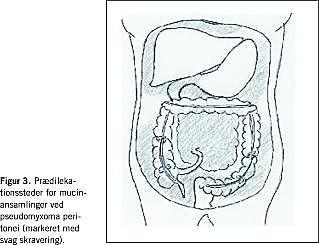 Ved laparoskopi eller laparotomi findes der typisk, ud over en patologisk omdannet appendix og evt. tumorinfiltrerede ovarier, mucinøs væske og peritoneal tumorvækst i det højre subdiafragmatiske og subhepatiske rum, omentum majus, pelvis, venstre colonrende, omkring Treitz' ligament og omkring milten (Figur 3 ). Heraf følger, at peritoneum viscerale beklædende colon, galdeblære og ventrikel ofte findes tumoromdannet. Årsagen til de beskrevne prædilekationssteder menes at være bl.a. tyngdekraften og åbentstående lymfelacunae på oment og under diagfragma [2]. Tyndtarmens evige peristaltik menes at hæmme implantation. Tyndtarmen er da også kun sjældent afficeret og da oftest i slutstadiet.