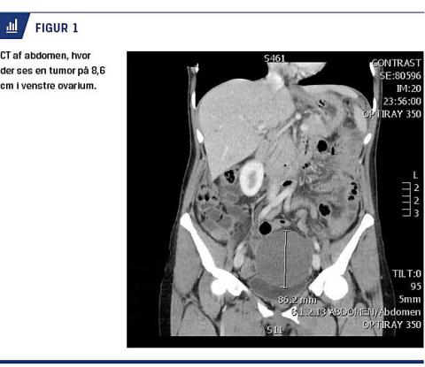 Ved den objektive undersøgelse fandt man abdomen med peritoneal reaktion og en udfyldning i venstre fossa. Ved indlæggelsen havde patienten en temperatur på 38 °C, koncentrationen af C-reaktivt protein var på 79 mg/l (normalværdi: < 8 mg/l) og koncentrationen af leukocytter på 12,2 × 109/l (normalområde: 3,5-10 × 109/l). En akut CT viste en 9 cm stor proces på venstre ovarium (Figur 1). Den blev radiologisk vurderet som en venstresidig ovariecyste med blødning og torsionssuspension. Man fandt en velplaceret spiral i uterus. Der var normale forhold i øvre abdomen, herunder pancreas.
