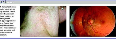 I. En 38-årig kvinde havde siden tiårsalderen haft noprede gullige hudforandringer i nakken og på halsen (Figur 1 A). Da hun var 23 år gammel, blev hun undersøgt af dermatolog, som beskrev gullige, brostensagtige papler konfluerende til plaques i nakken og symmetrisk bagtil på halsens sideflader. Hudstansebiopsi viste kalkaflejringer (von Kossa-farvning) i de elastiske fibre. Ekkokardiografi var normal. Hun havde ingen synsforstyrrelser, men en øjenundersøgelse viste angioide streaks. I relation til genetisk rådgivning viste det sig, at moderens kusine havde PXE med svær øjenpåvirkning.