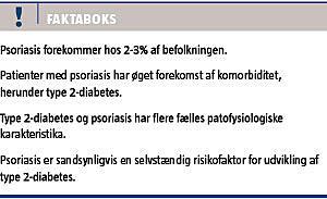 Psoriasis er en kronisk, inflammatorisk hudsygdom, som klinisk ses i form af røde, skarpt afgrænsede, skællende plaques på huden. Prævalensen er 2-3% i Nordeuropa, og tilstanden forekommer lige hyppigt hos mænd og kvinder. Traditionelt set er psoriasis blevet opfattet som en isoleret sygdom i huden, men forskning har vist, at psoriasis snarere bør betragtes som en autoimmun, systemisk sygdom med betydelig involvering af immunapparatets celler. Patogenesen til psoriasis er ukendt, men antages at være multifaktoriel. I de senere år er der kommet stigende fokus på forekomsten af komorbiditet, i særdeleshed type 2-diabetes og kardiovaskulær sygdom ved psoriasis. Skønt associationen kan skyldes fælles risikofaktorer, tyder meget på, at psoriasis i sig selv er en uafhængig og selvstændig risikofaktor ved både type 2-diabetes og kardiovaskulær sygdom. Sammenhængen mellem psoriasis og aterotrombotisk sygdom er tidligere blevet beskrevet i Ugeskrift for Læger [1]. I nærværende oversigtsartikel gives en kort og systematisk gennemgang af den foreliggende litteratur om sammenhængen mellem psoriasis og type 2-diabetes.
