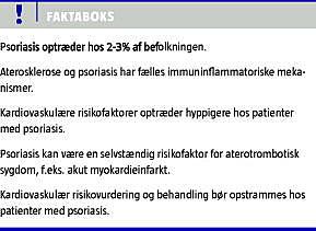 Psoriasis og aterosklerose har fælles immunoinflammatoriske mekanismer, og der kan hos patienter med psoriasis være øget forekomst af kardiovaskulære risikofaktorer (hyperkolesterol-æmi, hypertension, overvægt, metabolisk syndrom, diabetes mellitus, rygning mv.), samt øget risiko for aterotrombotisk sygdom. Nærværende oversigt resumerer den foreliggende evidens på området og opfordrer til et øget fokus på kardiovaskulær risikovurdering og behandling hos patienter med psoriasis.