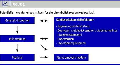 Psoriasis (PS) er en kronisk inflammatorisk hudsygdom, der optræder hos 2-3% af befolkningen i Nordeuropa og karakteriseres ved forekomst af skarpt afgrænsede, højrøde og skældannende hudelementer, ofte på ekstremiteternes ekstensorsider og i hårbund [1]. PS kan også antage en pustuløs form, samt hos 5-20% afficere leddene (PS-artritis). Behandlingen omfatter bl.a. lokalbehandling (bl.a. D-vitaminanalog, steroid og sjældnere tjærepræparater), fototerapi, samt systemisk behandling, inklusive traditionelle (methotrexat, retinoider og ciclosporin) og biologiske midler (tumornekrosefaktor (TNF)-α-hæmmere mv.) [2]. Aterosklerose er ligeledes en kronisk inflammatorisk sygdom, og der er i dag evidens for, at patogenesen ved PS og visse andre inflammatoriske sygdomme, f.eks. reumatoid artritis og systemisk lupus, har lighedspunkter med mekanismerne ved aterosklerose, ligesom disse lidelser er associerede til øget risiko for aterotrombotisk sygdom, specielt akut myokardieinfarkt (AMI) [3, 4]. Skønt denne association kan skyldes fælles risikofaktorer, f.eks. rygning og hypertension, tyder meget på, at PS er en selvstændig og uafhængig risikofaktor for aterotrombotisk sygdom (Figur 1 ) [4, 5]. Der er tiltagende interesse for dette emne og pga. dets betydelige kliniske implikationer, har vi fundet det relevant at give en kort oversigt over den eksisterende litteratur inden for området.