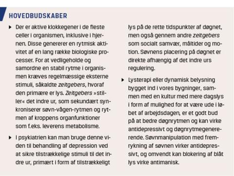 i psykiatrien arbejder man på at modvirke for sen søvn gennem mere morgenlys og mindre blåt aftenlys samt ved at styrke zeitgeber-styrken af daglige aktiviteter. Den endogene døgnrytme kan undersøges ex vivo i hudbiopsier med ekspression af klokkegener (Bmal 1). Disse viser en stor individuel forskel i døgnrytmelængde med en variation på 23-26 timer [28]. Hos personer med en døgnrytme, der afviger meget fra 24 timer, kan man forestille sig, at der stilles større krav til organismens evne til entrainment [29], og navnlig hos disse personer kan belysningsforhold i hjemmet og på arbejdspladsen samt lysvaner og arkitektur antages at være af betydning for deres psykiske velvære og måske risiko for udvikling af psykisk sygdom.