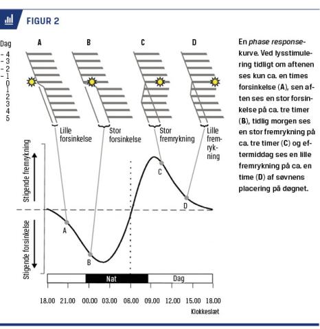 Kronobiologi er læren om primært cirkadiske rytmer i det biologiske system med en periode på ca. 24 timer. Entrainment beskriver, hvordan et regelmæssigt eksternt stimulus fra en såkaldt zeitgeber justerer døgnrytmen til 24 timer (Figur 1). Lys fungerer som den vigtigste zeitgeber, der via retinale receptorer til hjernens biologiske ur i nucleus suprachiasmaticus (SCN) opretholder en stabil 24-timers søvn-vågen-rytme. Et lyssignal om morgenen medfører en fremrykning af søvnen til tidligere på døgnet, mens lys om aftenen medfører en forsinkelse af søvnen til senere på døgnet (Figur 2). Andre vigtige zeitgebers er social kontakt, spisning og motion, som på lignende måde har forskellige effekt på døgnrytmen afhængig af tidspunktet for stimulering. Ved fravær af zeitgebers, dvs. under isolation og svagt lys, vil søvn-vågen-rytmen have en periodelængde på ca. 24,2 timer og således drive til senere på døgnet. Næsten alle kroppens celler, inklusive kortikale neuroner, har klokkegener. Disse har behov for tidsgiversignaler fra SCN for at sikre et orkestreret samspil af organfunktionerne. Et dertil knyttet klinisk begreb er kronotype, der angiver en persons præferencer for aktivitet gennem døgnet (A- og B-mennesker). Kronoterapi er behandling, der er baseret på korrektion af døgnrytmen og den sæsonbetingede rytme. Sæsonbetingede ændringer i søvn, social funktion, humør, appetit og energi kan vurderes med Seasonal Pattern Assessment Questionnaire (SPAQ).