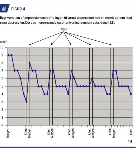 Søvninterventioner bygger på ældre observationer af døgnvariation i depressionssymptomer med morgenvånde og aftenlysning hos patienter med melankolsk depression. Fænomenet er beskrevet helt tilbage til 1818 [20], hvor man var opmærksom på, at patienter med melankoli bedredes efter søvndeprivation. Dette blev først mere systematisk undersøgt af Burkhard Pflug i 1973 [21]. Siden er der udført en mængde kliniske studier med søvndeprivation (vågenterapi), hvor man har bekræftet en akut antidepressiv effekt hos ca. 60% efter første nat uden søvn, men også med en betydelig risiko for tilbagefald, som man gennem nyere metoder med søvnfremrykning, søvnrytmestabilisering, lysterapi, litiumbehandling og antidepressive præparater med en vis succes har forsøgt at minimere [22]. Det er fundet, at god effekt af første vågenterapi (i en serie) og tilstedeværelsen af døgnvariation (Figur 4) er prædiktorer for vedvarende effekt [23], men vi mangler stadig at kunne indsnævre mere præcist, hvilke patienter der har gavn af metoden [24].