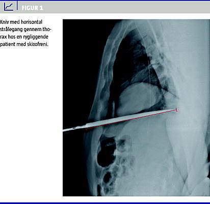 Under den aktuelle tvangsindlæggelse fik patienten i skadestuen fat i en brødkniv og stak sig dybt i thorax og perforerede den ene hjerteventrikel (Figur 1 ).