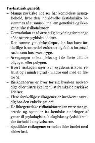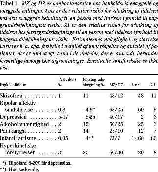 Adskillige psykiske lidelser ses hyppigere blandt slægtninge til syge end i befolkningen som helhed og hyppigere hos begge tvillinger for enæggede end for toæggede tvillinger (Tabel 1 ). Dette sandsynliggør, at genvarianter er involveret i sygdommenes fremkomst. For flere af lidelserne støttes dette af adoptionsundersøgelser. For forskellige undergrupper af flere af lidelserne er den genetiske komponent stærkere end for lidelsen som helhed. Undersøgelser har også peget på, at genetiske faktorer er af betydning for udvikling af generaliseret angst, anorexia nervosa, obsessiv-kompulsiv tilstand, enkelfobi og social fobi. Særlig bipolar affektiv sindslidelse ses ofte hos mange medlemmer i en familie og har relativt høje konkordansrater i tvillingestudier, således at den genetiske komponent formentlig er stærkere end for mange andre komplekse sygdomme. Nogle forskellige psykiske lidelser optræder hyppigere end forventet i de samme familier og hos enæggede tvillinger, hvilket peger på, at disse lidelser helt eller delvist deler risikogener.