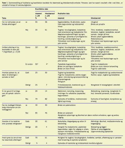 Resultater: De fleste patienter mente, at indførelsen af skærmede enheder var et godt behandlingstiltag. Få anså den låste dør som et problem. Mange fremhævede forståelse, tryghed og beskyttelse blandt de væsentligste fordele ved at være indlagt på en skærmet enhed. Utilfredshed og oplevelse af at blive krænket i forhold til et ophold i skærmet enhed blev fundet relateret til sværhedsgraden af psykopatologi, men der var ingen signifikant forskel mellem de to undersøgte grupper. Ingen fandt imidlertid den tidvist aflåste dør blandt de tre største ulemper ved at være indlagt. Omkring halvdelen af patienterne i den skærmede enhed ønskede sig bedre informeret.