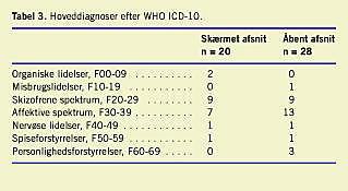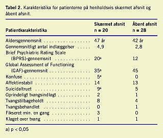 Diagnostisk var der ikke væsentlig forskel mellem patienter i skærmet og åben enhed. Ved en samlet klinisk lægelig vurdering og bedømmelse ud fra journal blev signifikant flere patienter i den skærmede enhed fundet selvmordstruede eller konfuse, mens der ikke var åbenlys forskel i graden af affektinstabilitet. En struktureret, psykopatologisk vurdering med BPRS viste i overensstemmelse hermed, at patienter i skærmet enhed var signifikant mere syge og havde en signifikant dårligere funktionsevne end kontrolgruppen. Der var ingen signifikant forskel på de to gruppers aldersfordeling.