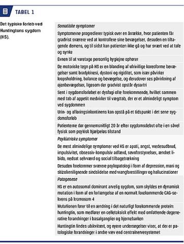 Huntingtons sygdom (HS) er en arvelig, neuropsykiatrisk sygdom, som klinisk er karakteriseret ved en triade (McHughs triade) af symptomer: motoriske, kognitive og psykiatriske. Symptomerne kan forekomme alene eller i kombination, og det er forskelligt fra person til person, hvilken af de tre symptomgrupper, som dominerer. Arvegangen er autosomal dominant, og sygdommen skyldes en mutation af en CAG-sekvens på kromosom 4, som medfører omfattende degenerative forandringer i basalganglierne og hjernebarken (Tabel 1). Der findes ingen kurativ behandling af HS eller interventioner, som kan bremse sygdommens udvikling. Behandlingen er symptomatisk.
